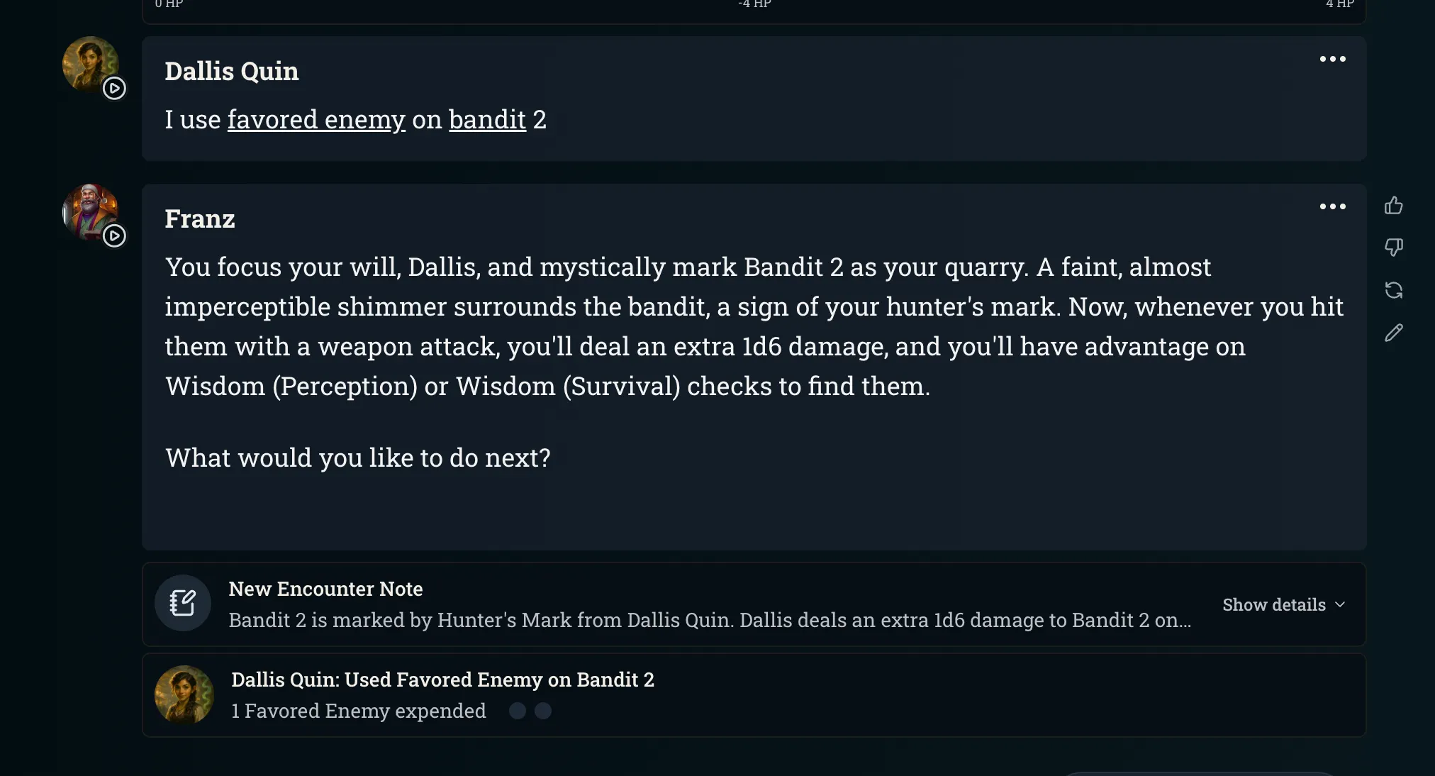 You’ll see resources used when you use an ability. Tip: call it out by name - ex. As a ranger, it’s better to say “I use one charge of favored enemy and cast hunter’s mark” instead of “I cast hunter’s mark”. This helps Franz differentiate between feature usage vs casting a spell normally.