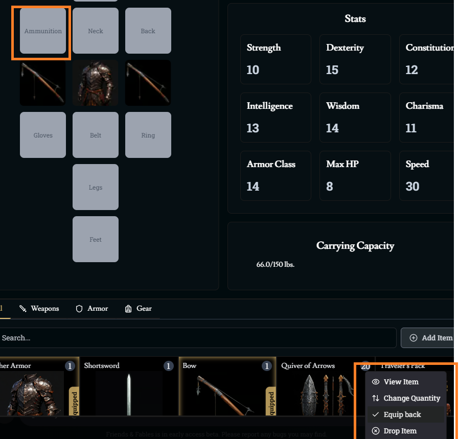 There’s a slot for ammunition but no way to equip it when you click on quiver of arrows for example.