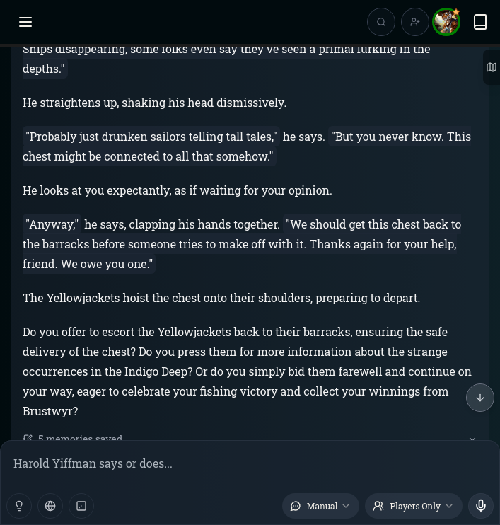 In the previous prompt, Franz asked if I wanted to ask about the box that the sailors pulled from the ocean. I said I was going to let them be and head to the tavern instead.