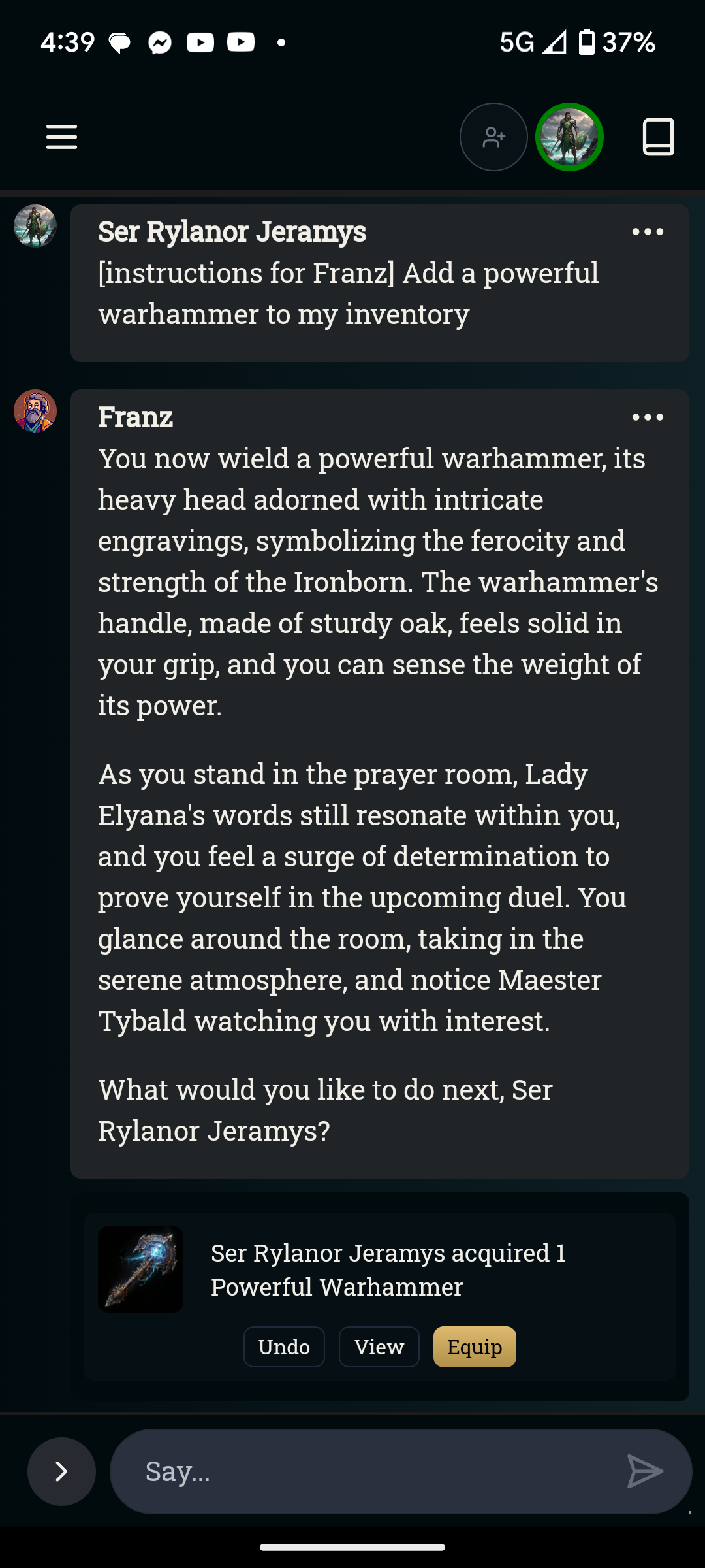 I tell Franz to generate a weapon or book and he does so just fine even adding it to inventory. When I request the same for armor he will generate a description and say I have it in my inventory now, but it's not there. This bug has really put a damper on immersion and it's present in each world I join. Will post browser if as soon as I figure out how to access browser for URL while I'm in game (I use app on smartphone) Here's a screen shot of interaction with weapon vs armor