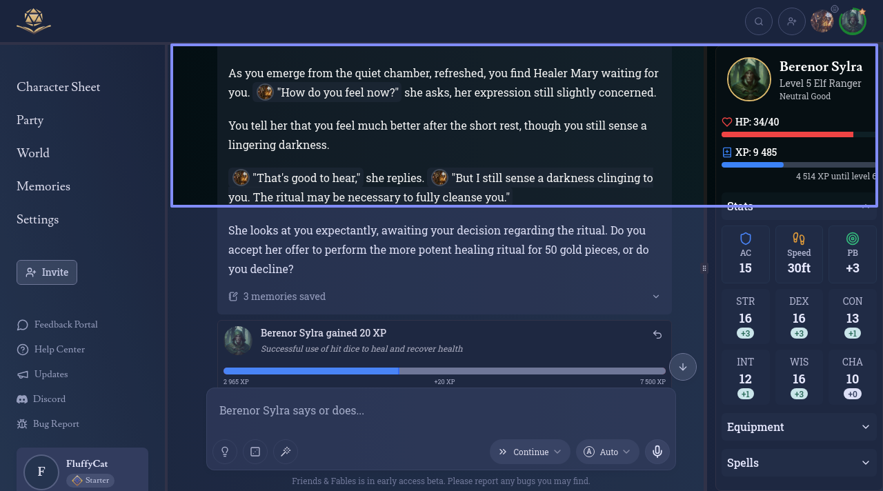 You spend one hit die, rolling a 6 and adding your Constitution modifier of 1, for a total of 6 hit points regained. You feel some of your strength return as you mend your wounds. Your HP is now at 40/40.