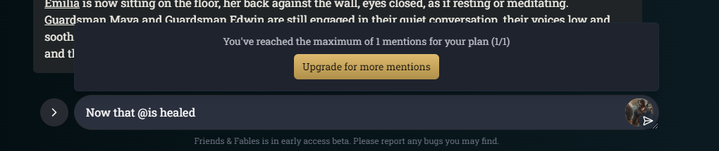 With the Free Trial account (and maybe the others), if you type ‘@’ (without single quotes) into a pre-existing message, similar to above, “Now that ‘@’ is healed” you get the above message that you’ve already used a mention, when in reality this is your first mention. If you delete all the text and type “Now that ‘@’ ” then the mention works.