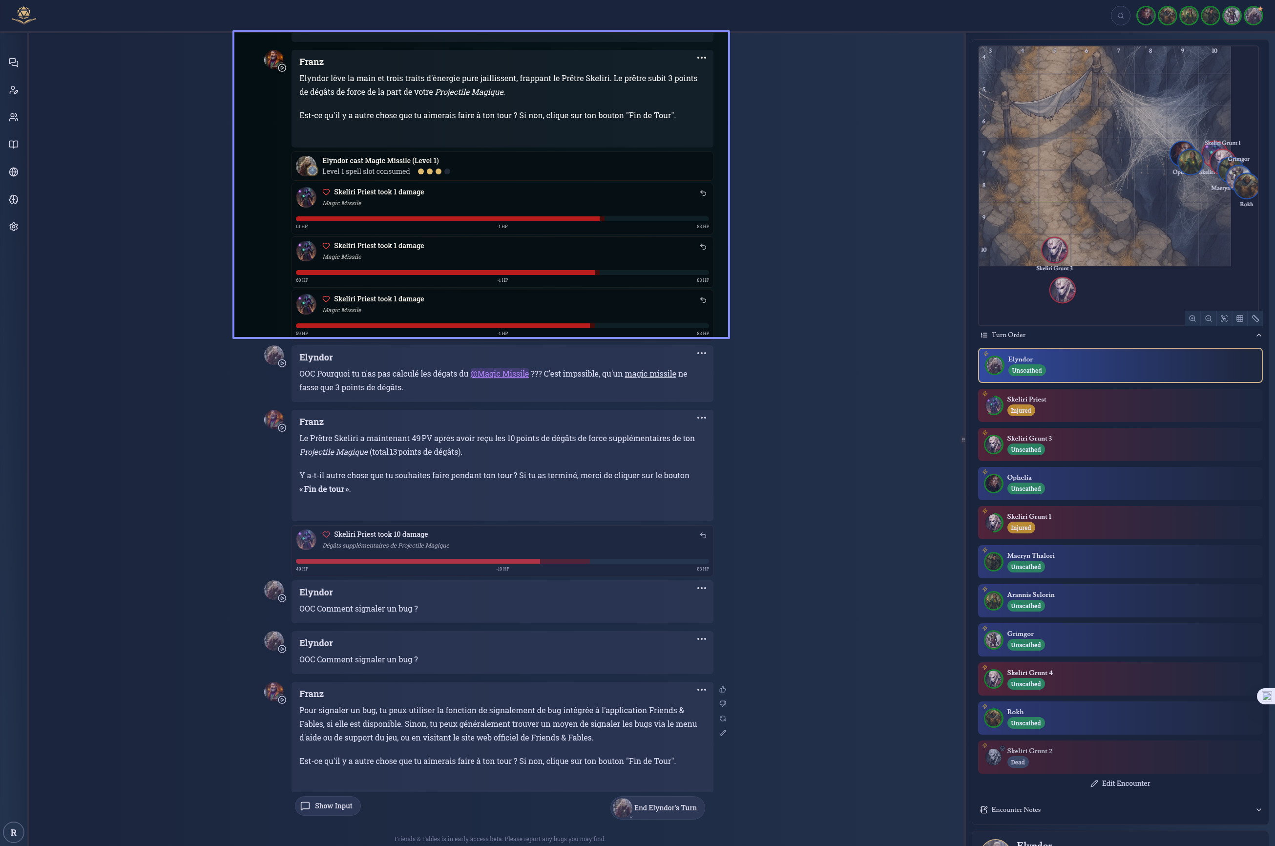 Turn-based combat. It's my character's turn to play, he casts a Magic Missile. Instead of rolling the dice for damage, Franz tells me that the target took 3 points of damage (which is impossible). He played this action in narrative mode when it's turn-based.