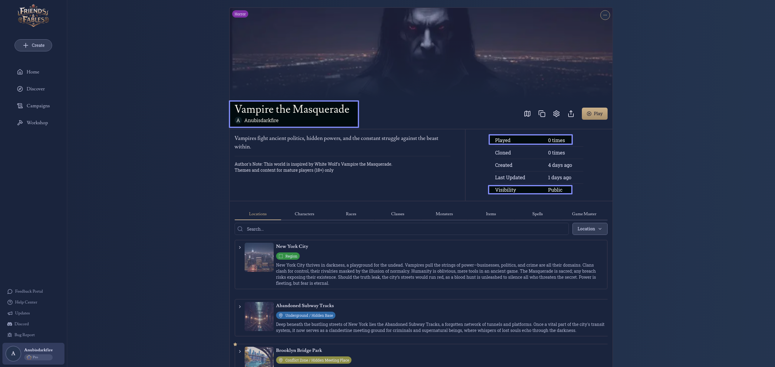I recently created a world called “Vampire the Masquerade” and set it’s status to PUBLIC. I have had multiple people say they are unable to access it from the link I put on the Friends and Fables share-public-creations channel.