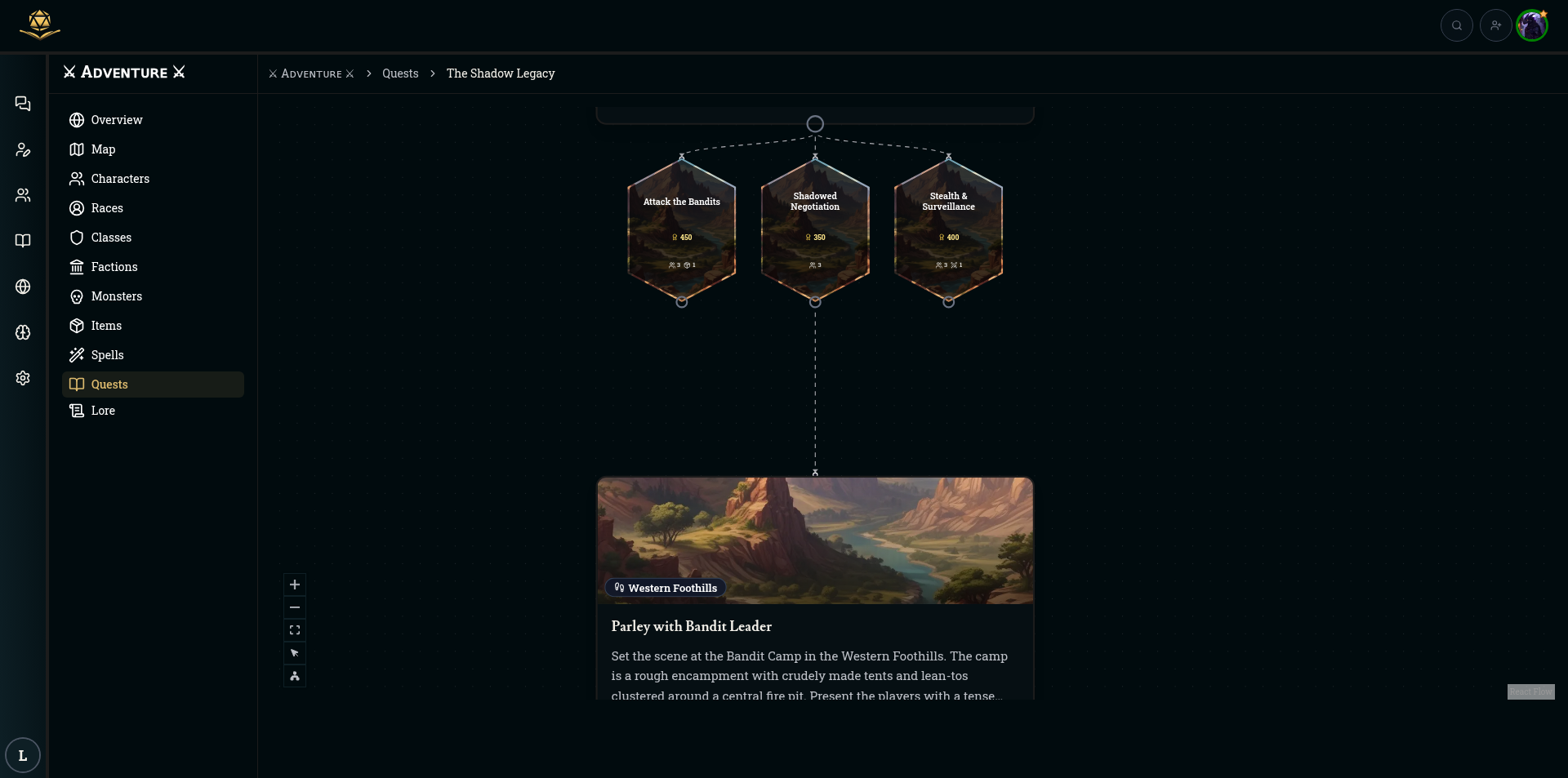 Set the scene as chaos erupts. The bandit camp is a rough sprawl of canvas tents and makeshift barricades lit by firepits. Bandits scramble for weapons as the leader barks orders. Describe torchlight flickering off jagged rocks, shadows twisting, and the faint pulse of violet light glowing beneath the ground, unnoticed at first.